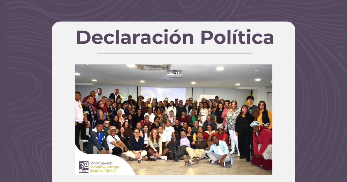 Finalmente, al conmemorar tres décadas de persistencia y resistencia, la Coordinación Colombia Europa Estados Unidos reafirma que la unidad y solidaridad de nuestras organizaciones es el bastión más sólido para enfrentar las injusticias que nos atraviesan en la actualidad. Nos despedimos de esta Asamblea Nacional con la convicción renovada de que la paz solo es posible sobre la base del respeto absoluto a los derechos humanos y la dignidad de los pueblos. Con la memoria de las personas que ya no nos acompañan como guía y la fuerza de los procesos territoriales como motor, seguiremos articulando esperanzas y disputando el futuro, convencidos de que nuestro compromiso histórico por un país justo, soberano y en paz es, hoy más que nunca, una tarea irrenunciable.
