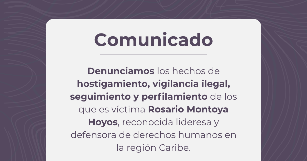 Denunciamos ante la opinión pública nacional e internacional los graves y sistemáticos hechos de hostigamiento, vigilancia ilegal, seguimiento y perfilamiento de los que es víctima Rosario Montoya Hoyos, reconocida lideresa y defensora de derechos humanos en la región Caribe.
